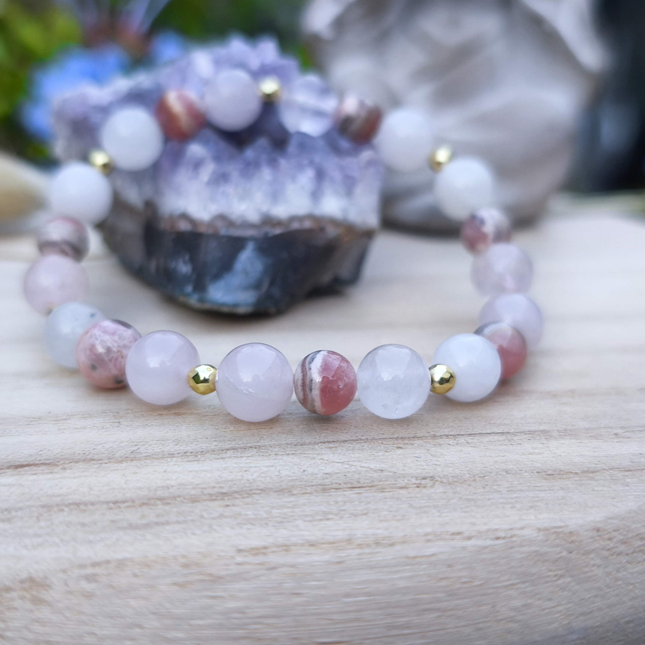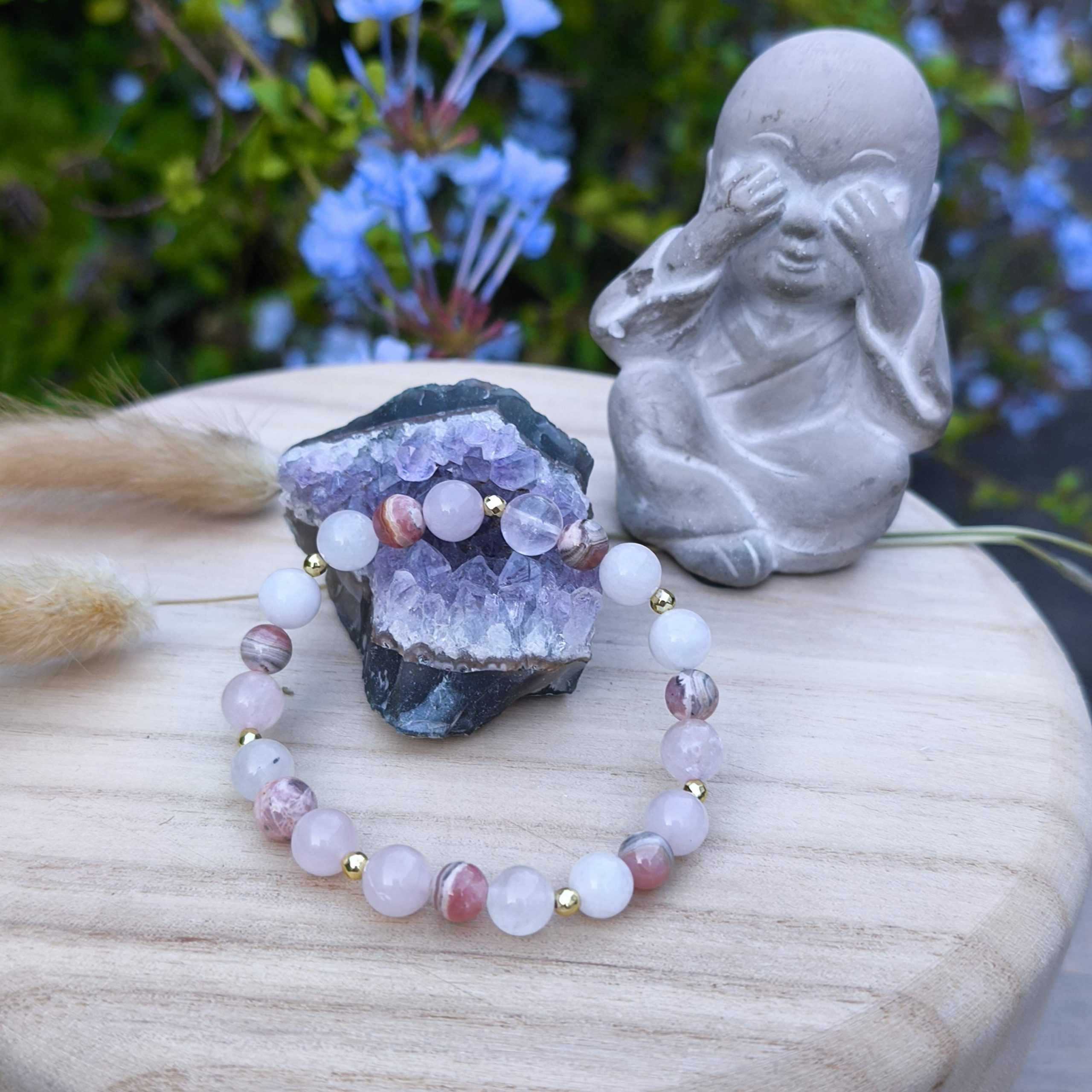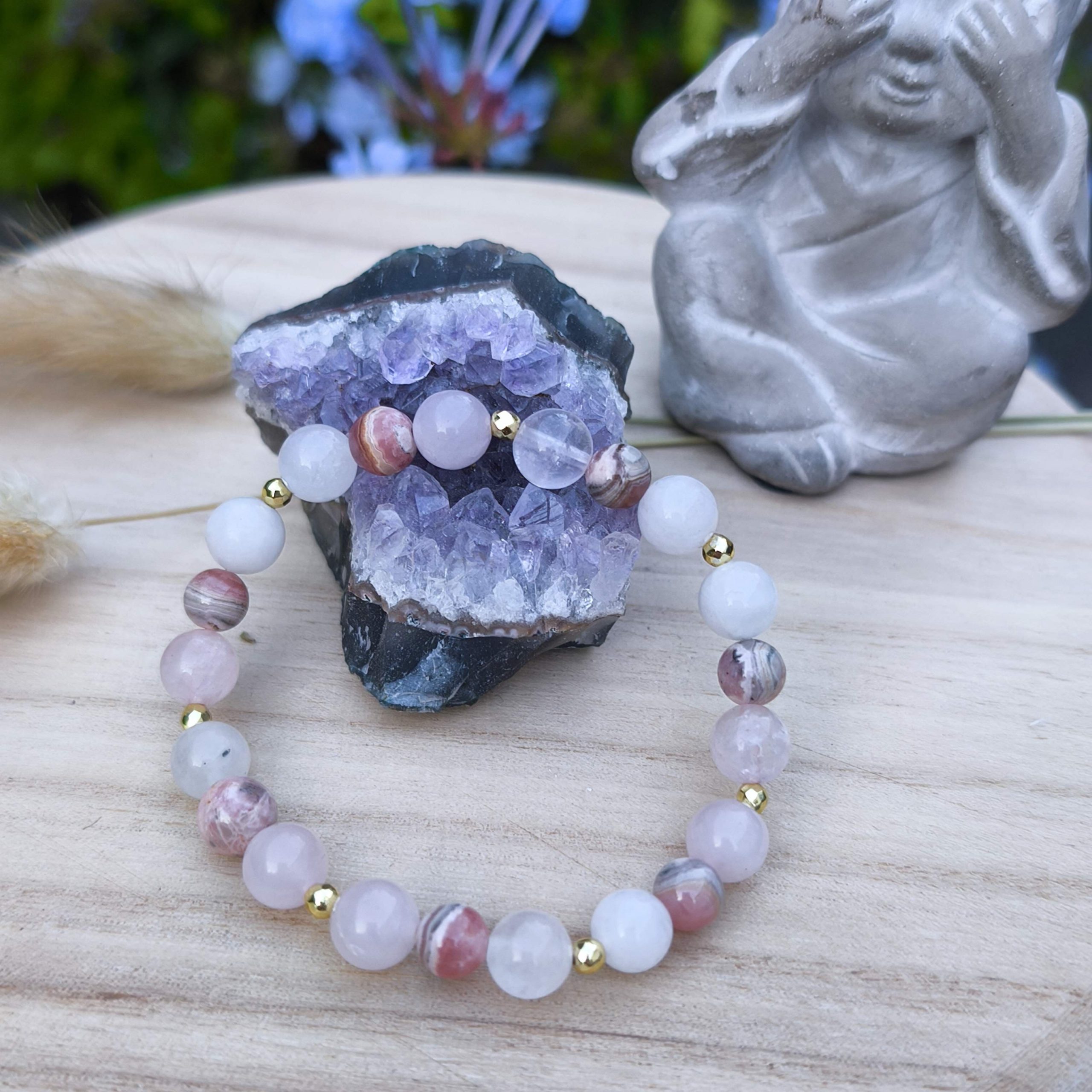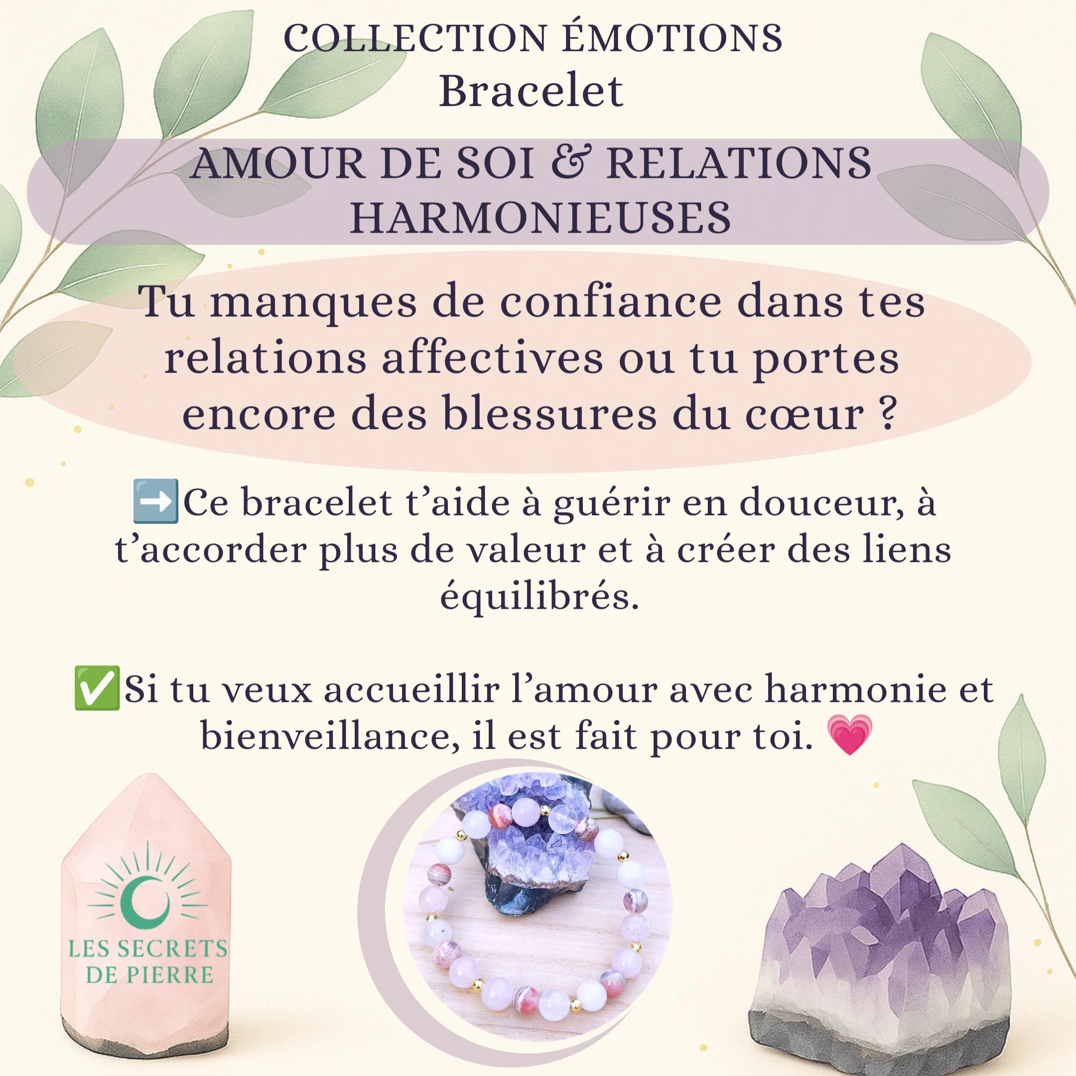 Ce bracelet agit comme un baume pour le cœur : il t’aide à guérir en douceur, à te libérer des blessures émotionnelles et à construire des relations plus saines et équilibrées. Son énergie invite à la tendresse, à la confiance et à l’harmonie dans les liens affectifs.