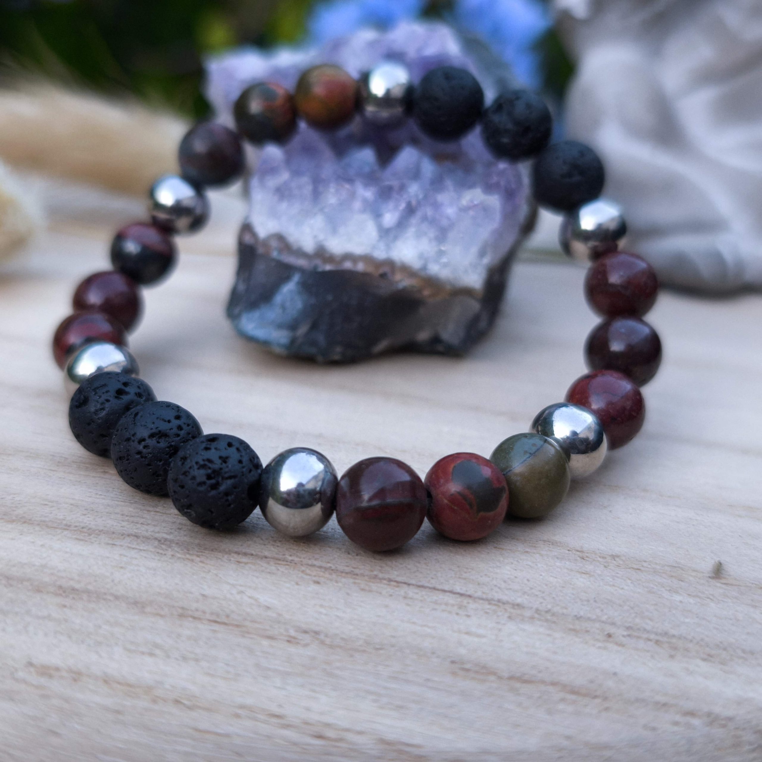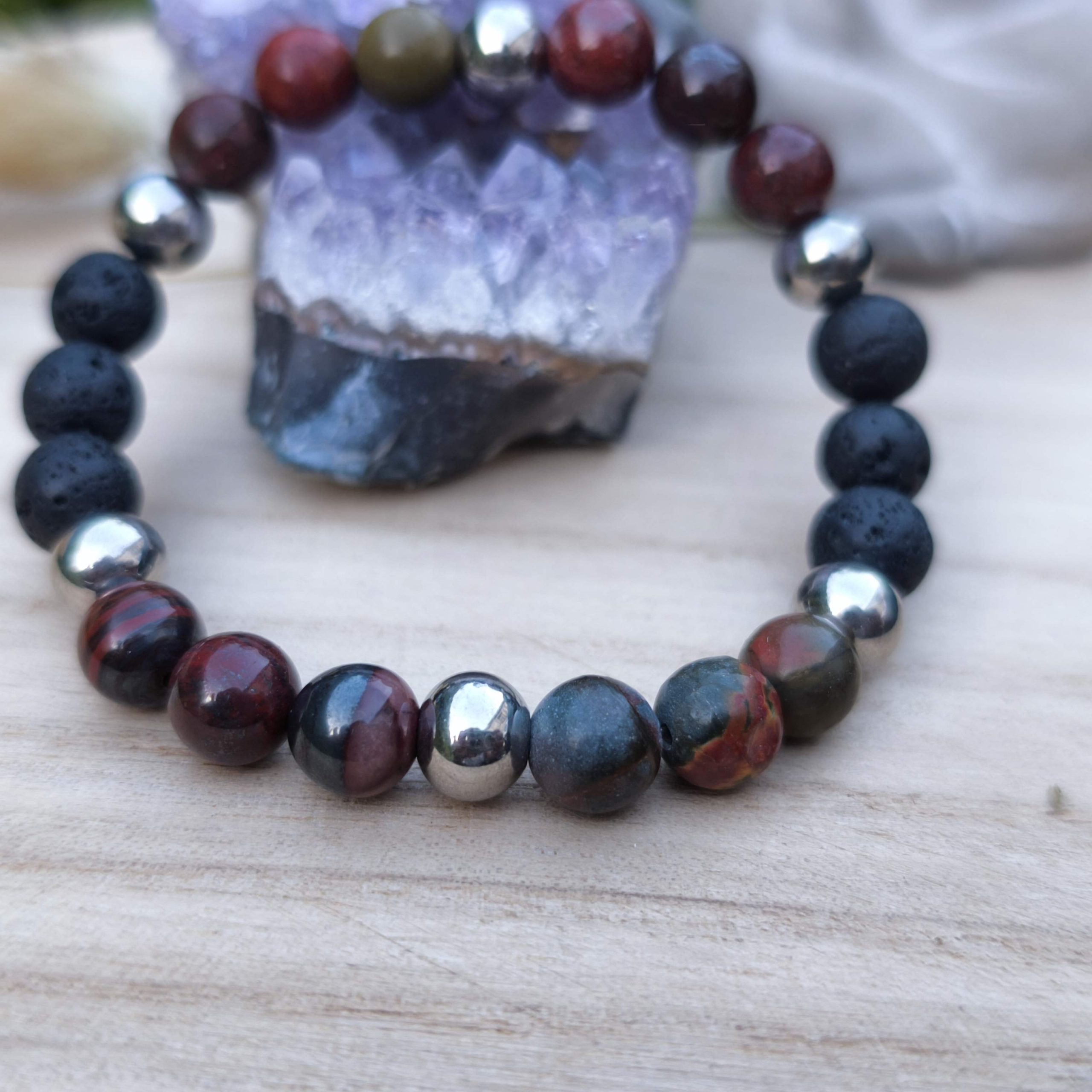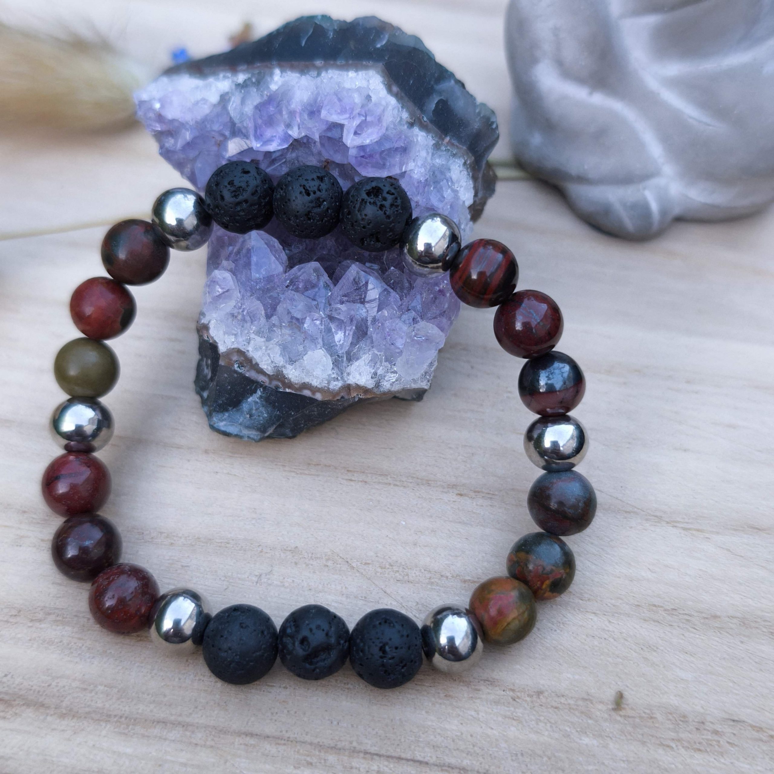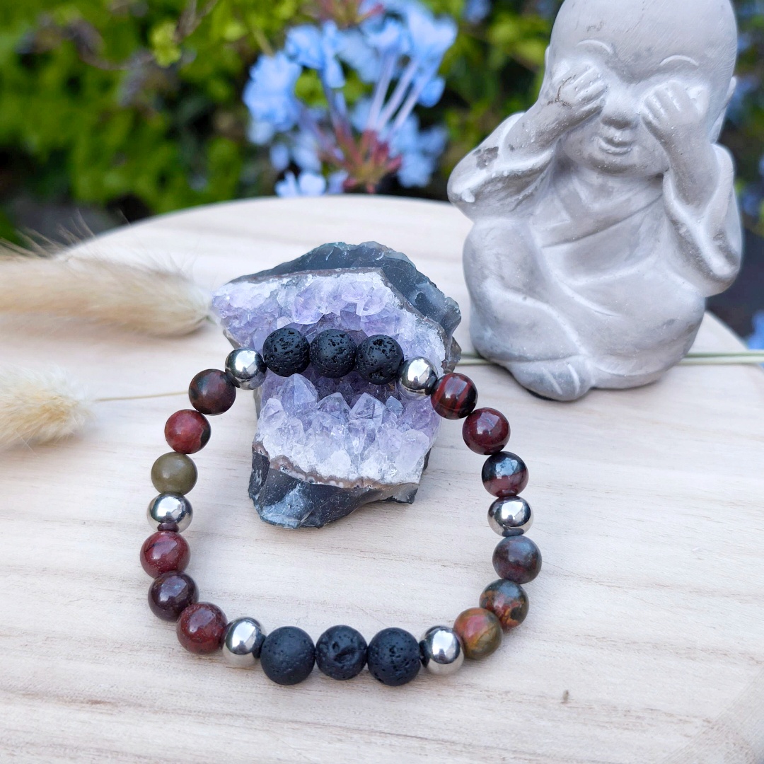 Bracelet Ancrage & Stabilité en jaspe polychrome, pierre de lave et œil de fer – perles 8 mm DQ.« Ancrage & Stabilité » – Jaspe polychrome, Pierre de lave & Œil de fer