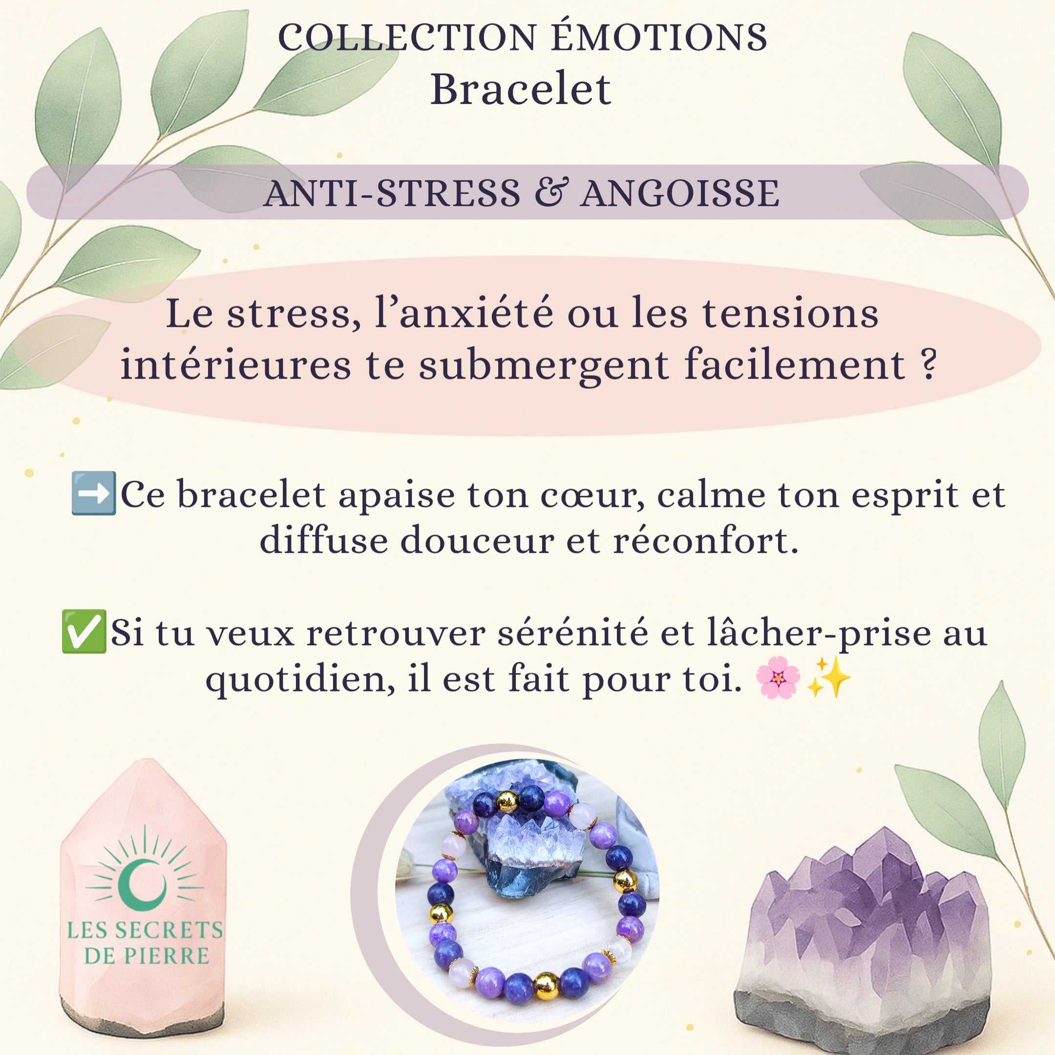 Ce bracelet est un allié précieux pour calmer le mental et apaiser les émotions fortes. Il t’accompagne dans les moments d’anxiété et de stress en apportant une énergie douce et réconfortante. Son action est idéale pour retrouver équilibre et harmonie intérieure au quotidien.
