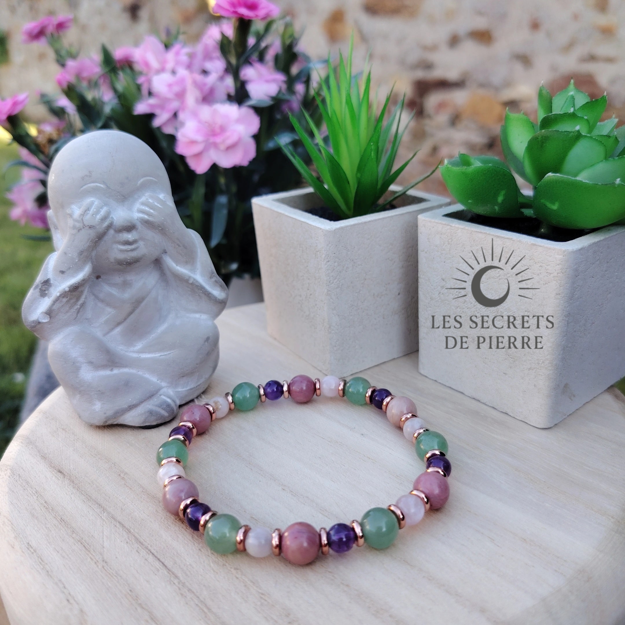 Cette création artisanale est composée de perles de 6 mm en kunzite et améthyste, associées à des perles de 8 mm en aventurine verte et rhodonite. L’alternance des tailles apporte un équilibre visuel raffiné et une complémentarité énergétique. Les intercalaires en acier inox rosé viennent sublimer l’ensemble, offrant élégance et durabilité.
