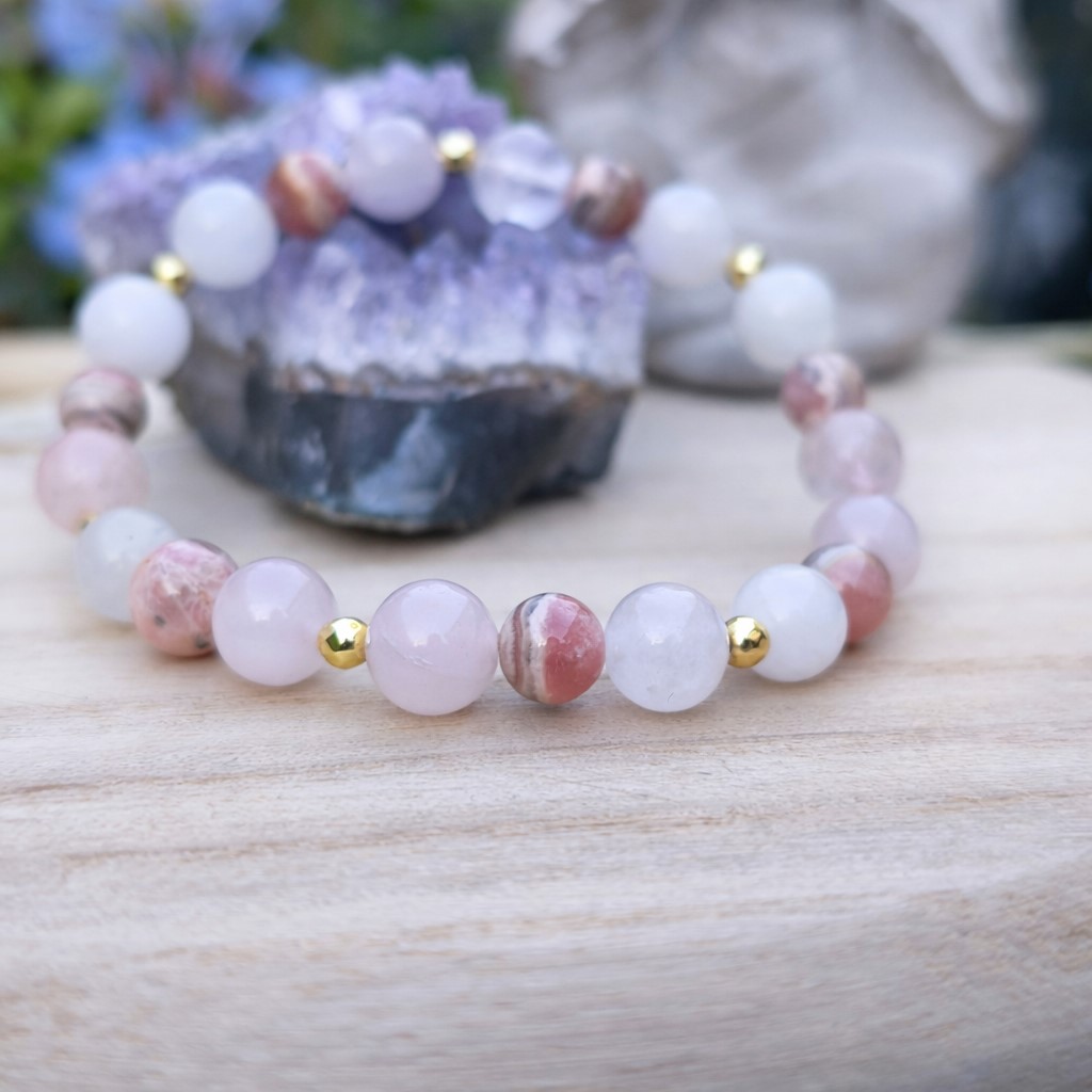 Ce bracelet associe plusieurs pierres naturelles reconnues pour leurs propriétés liées au cœur et aux relations.