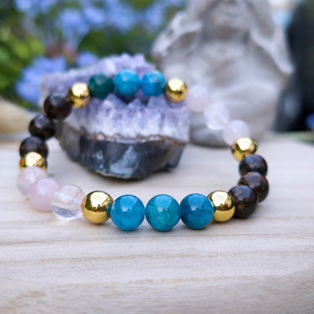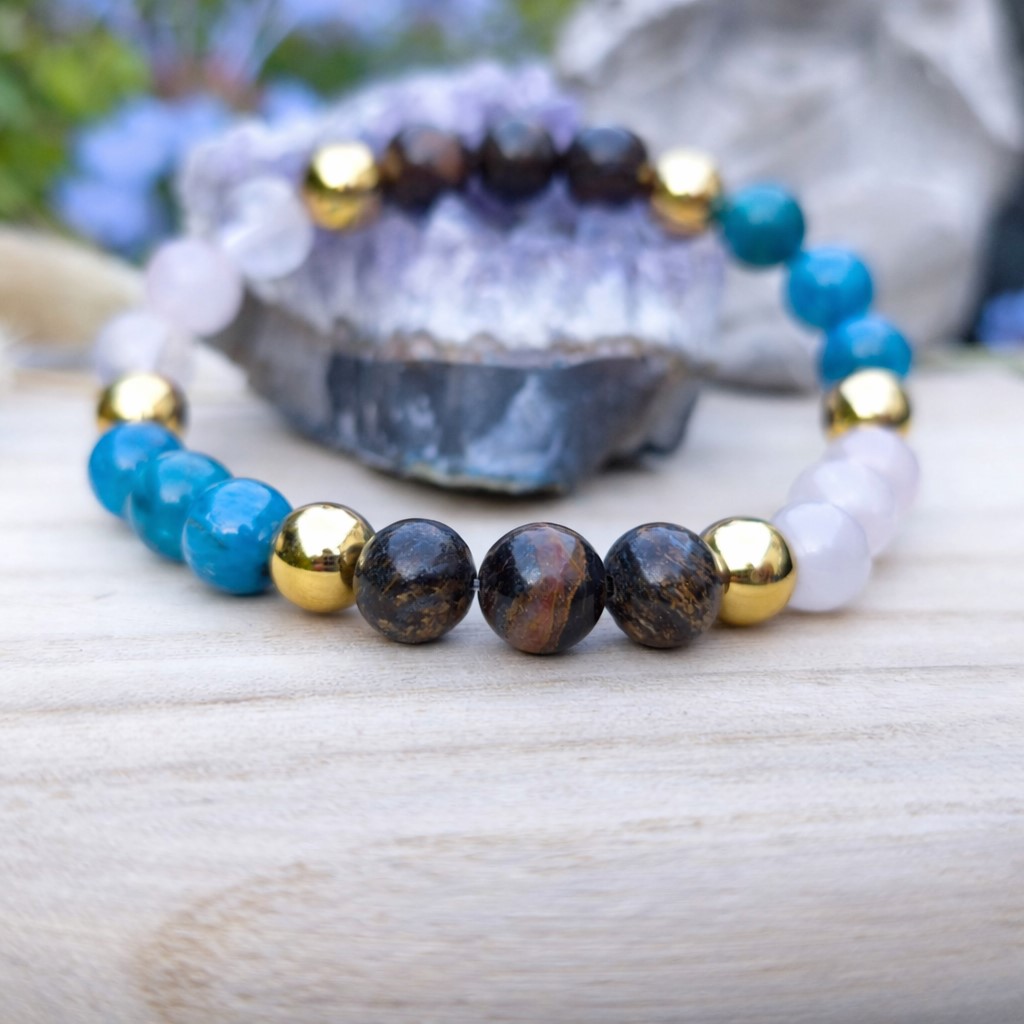 Ce bracelet associe plusieurs pierres naturelles choisies pour leurs propriétés complémentaires.