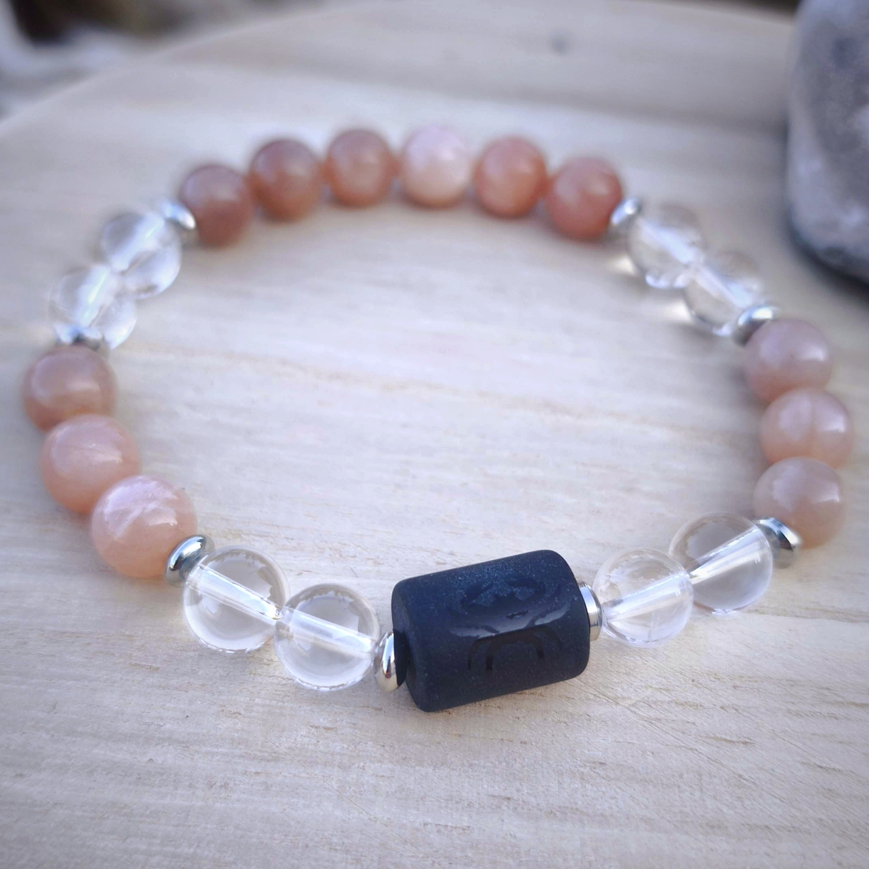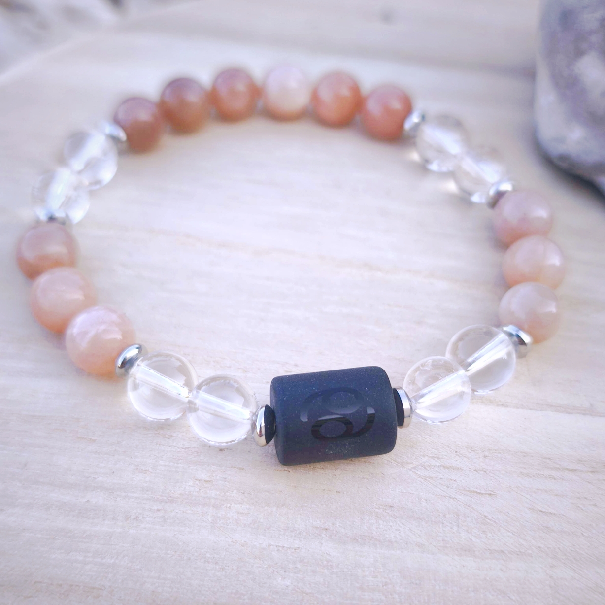 Ce bracelet est composé de cristal de roche (clarité et amplification), de pierre de lune (intuition, équilibre émotionnel, énergie maternelle) et d’une perle cylindrique en onyx mat gravée du signe du Cancer en poli brillant.
