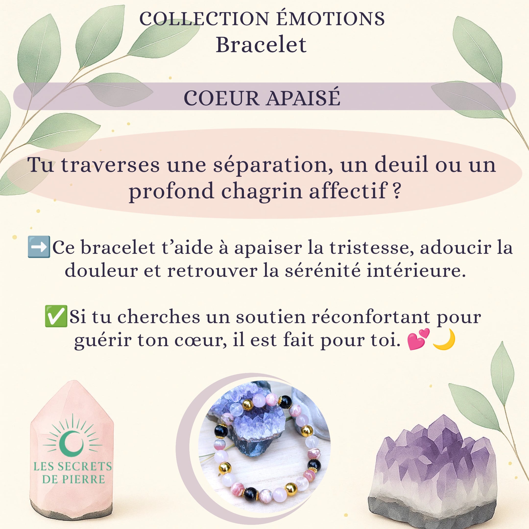 Ce bracelet a été conçu comme un véritable baume pour l’âme : il accompagne dans les périodes de tristesse, adoucit la douleur et aide à traverser les épreuves affectives. Son énergie douce et rassurante t’offre un appui solide pour guérir ton cœur et réinstaller une paix émotionnelle.