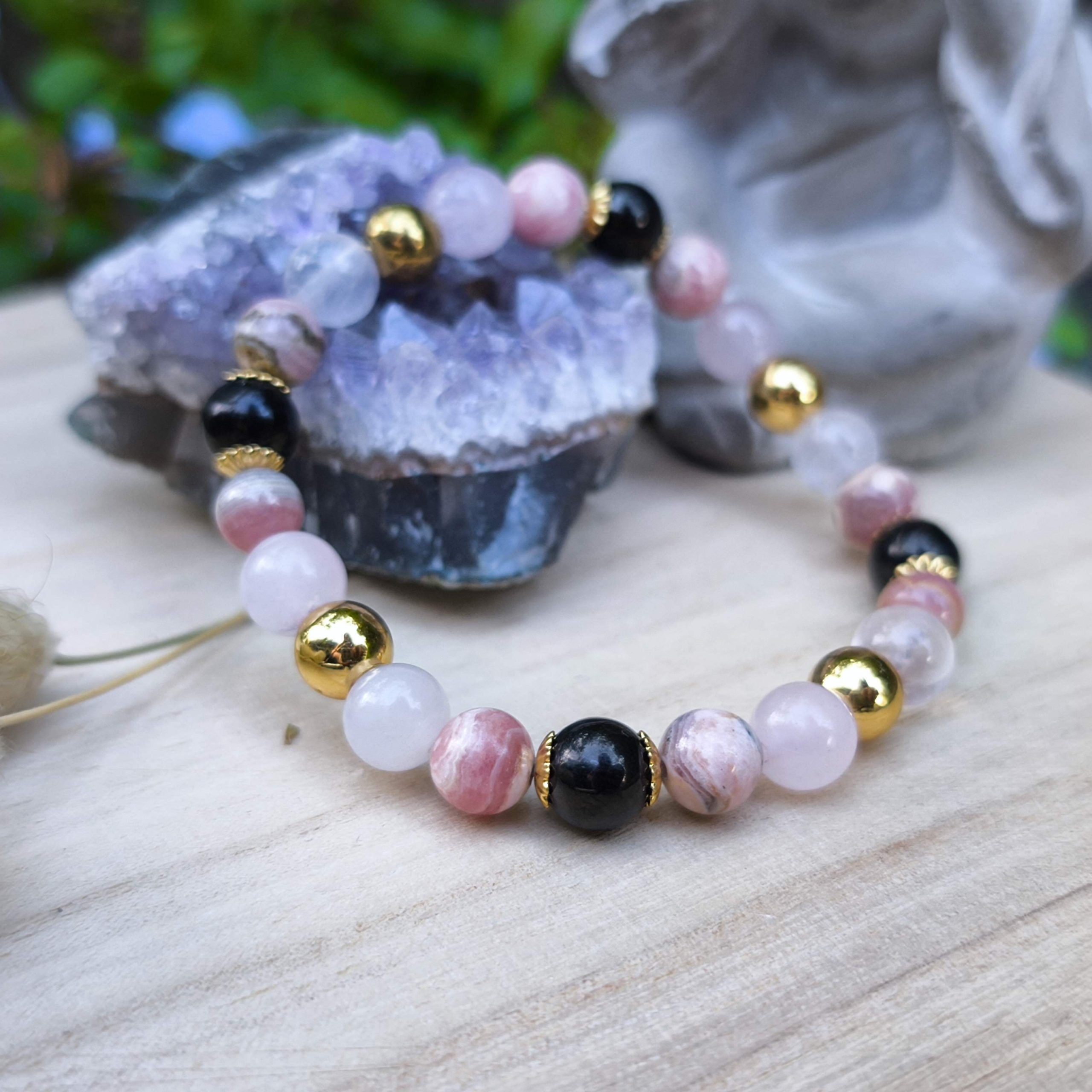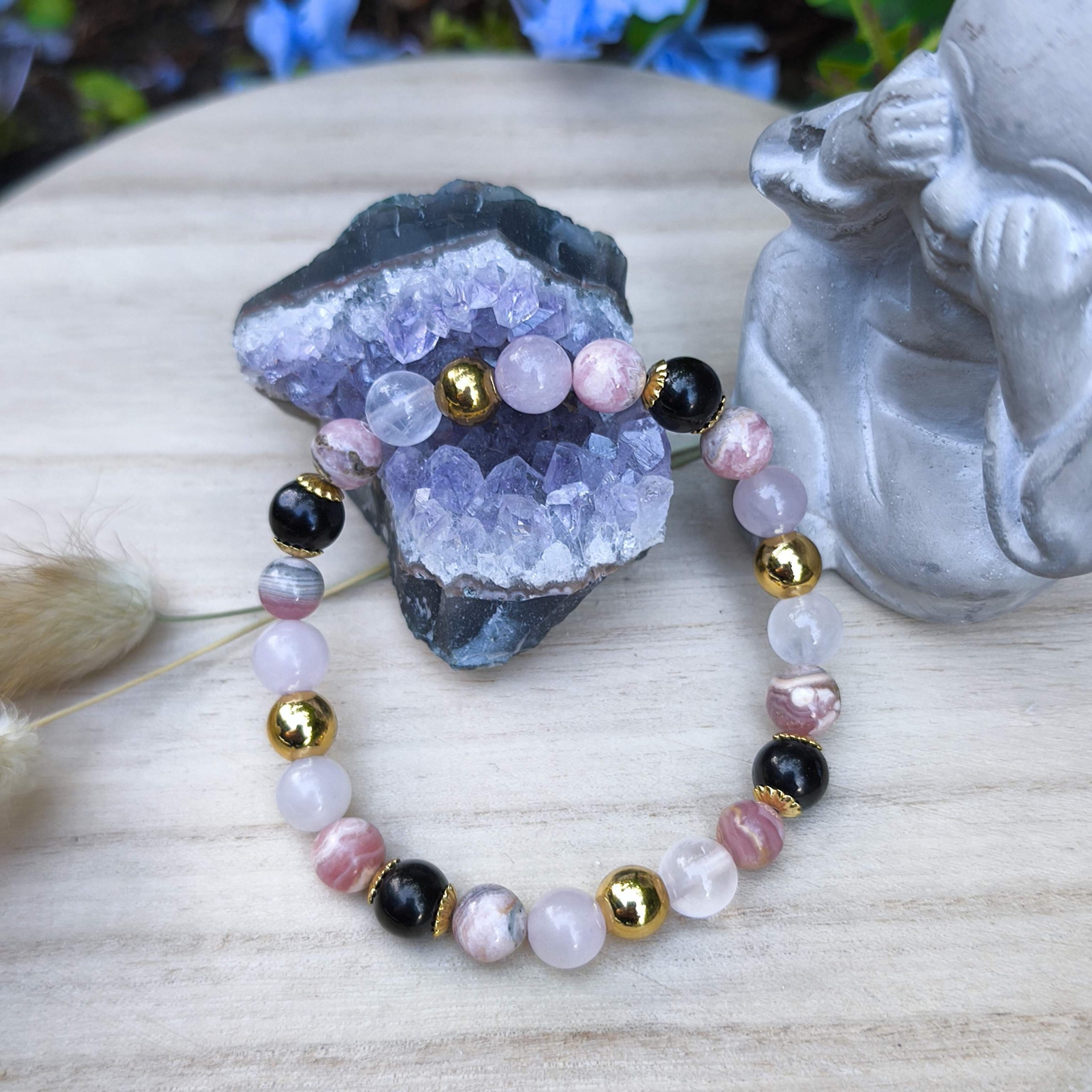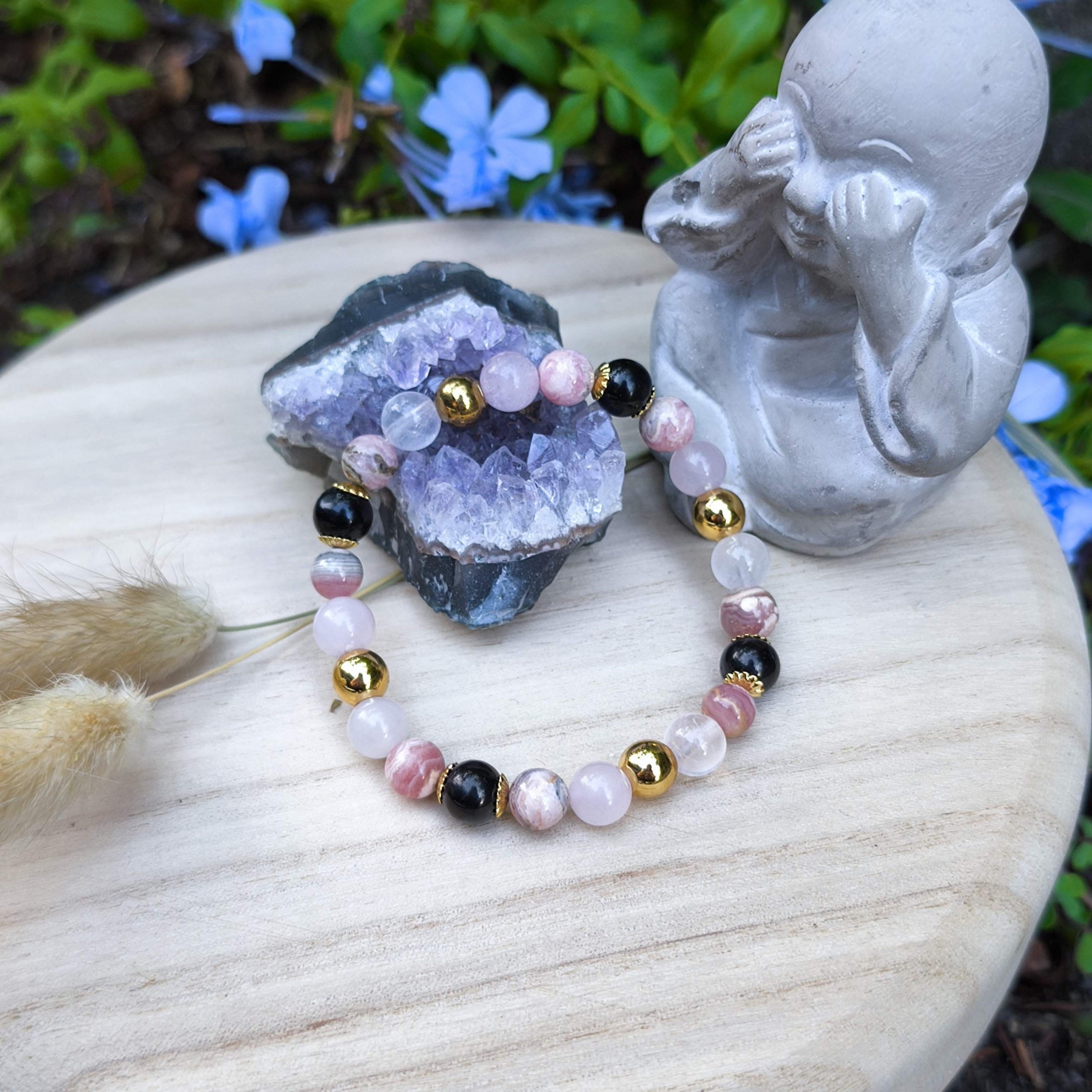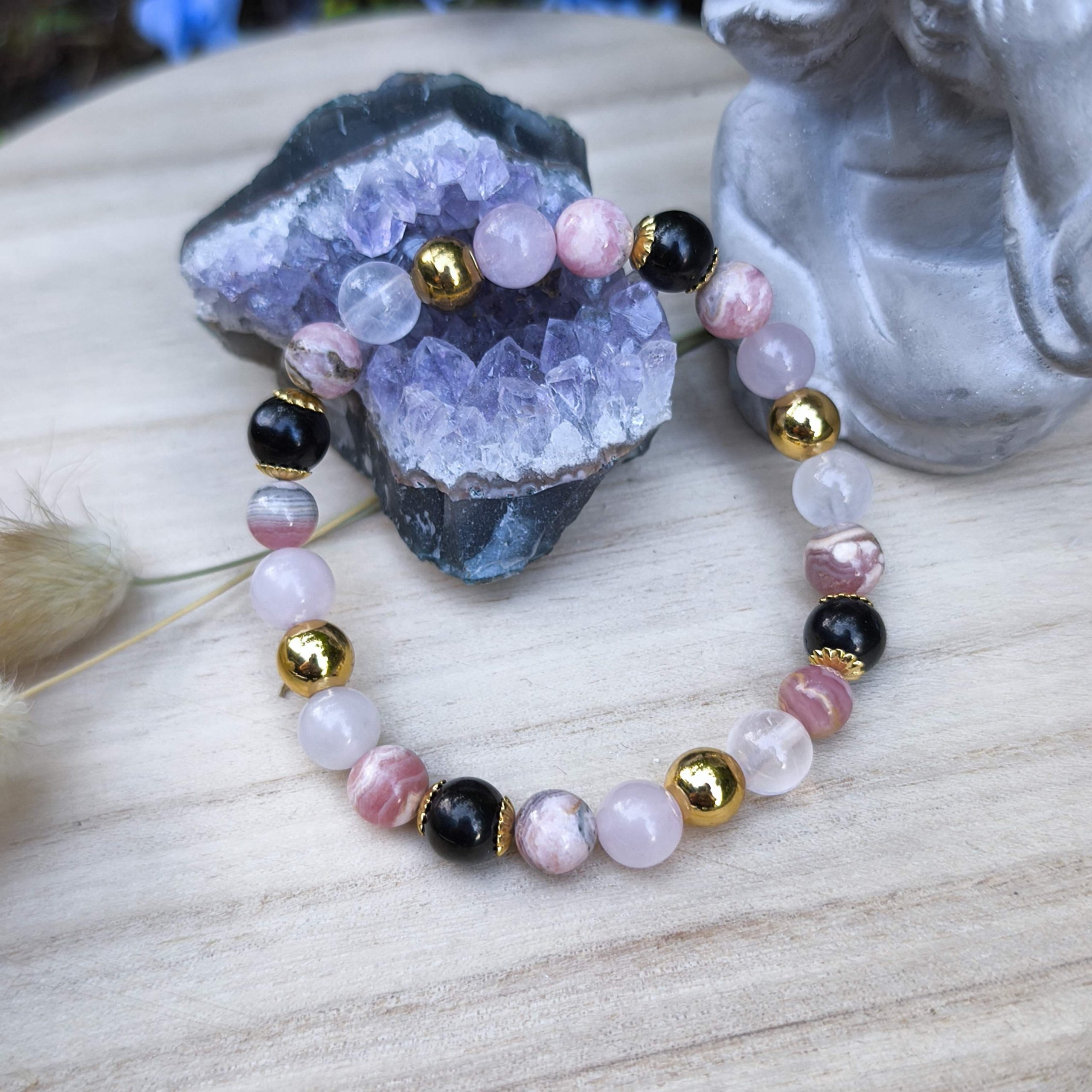 « Cœur Apaisé » – Quartz rose, Rhodochrosite & Jais