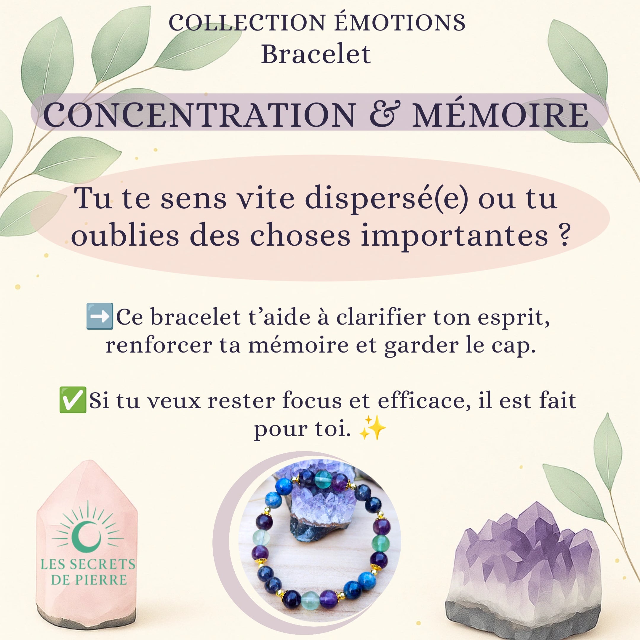 Ce bracelet est un véritable allié pour soutenir tes capacités intellectuelles : il t’aide à fixer ton attention, à retenir les informations plus facilement et à structurer tes idées avec clarté. Idéal pour les périodes d’apprentissage, de travail ou de réflexion soutenue.
