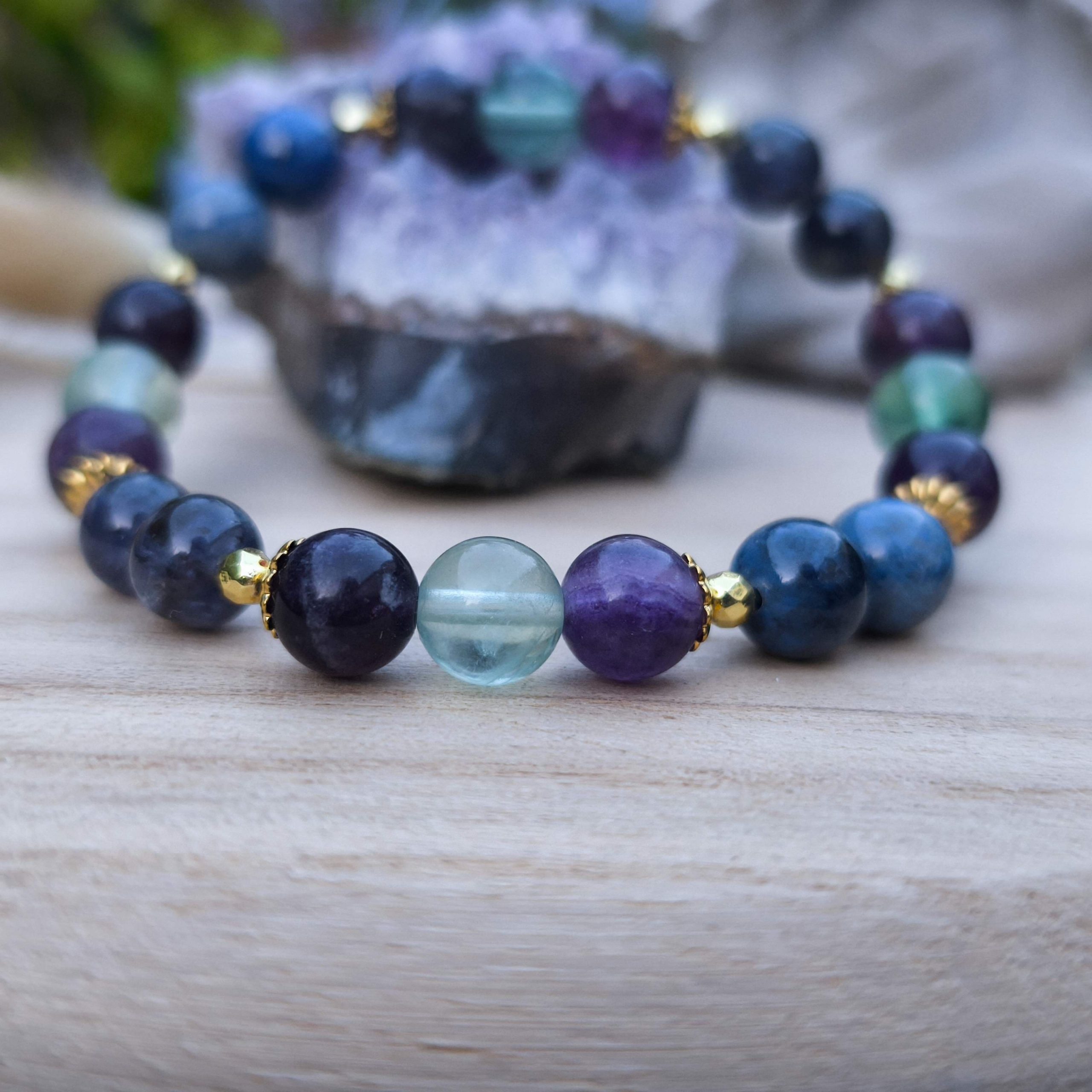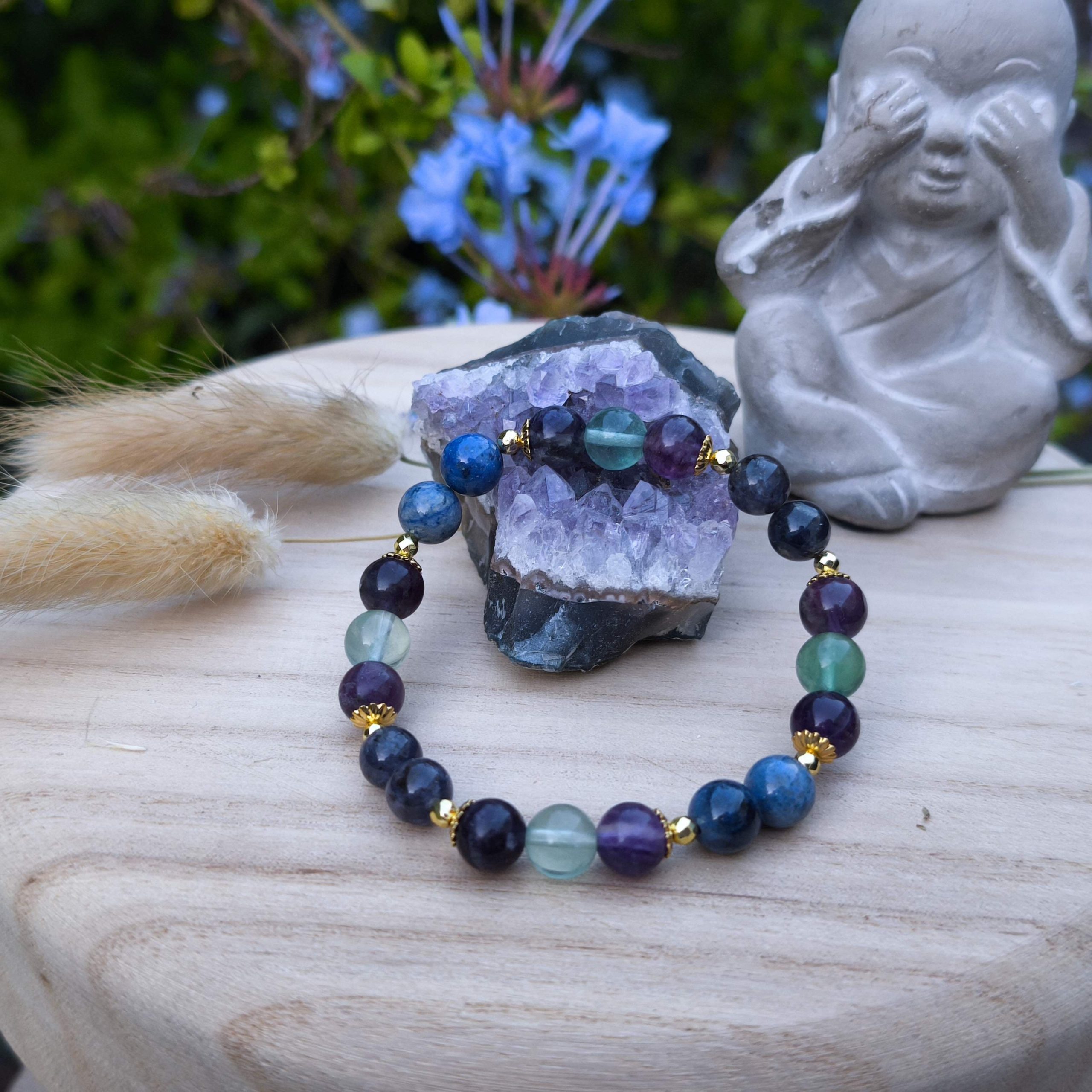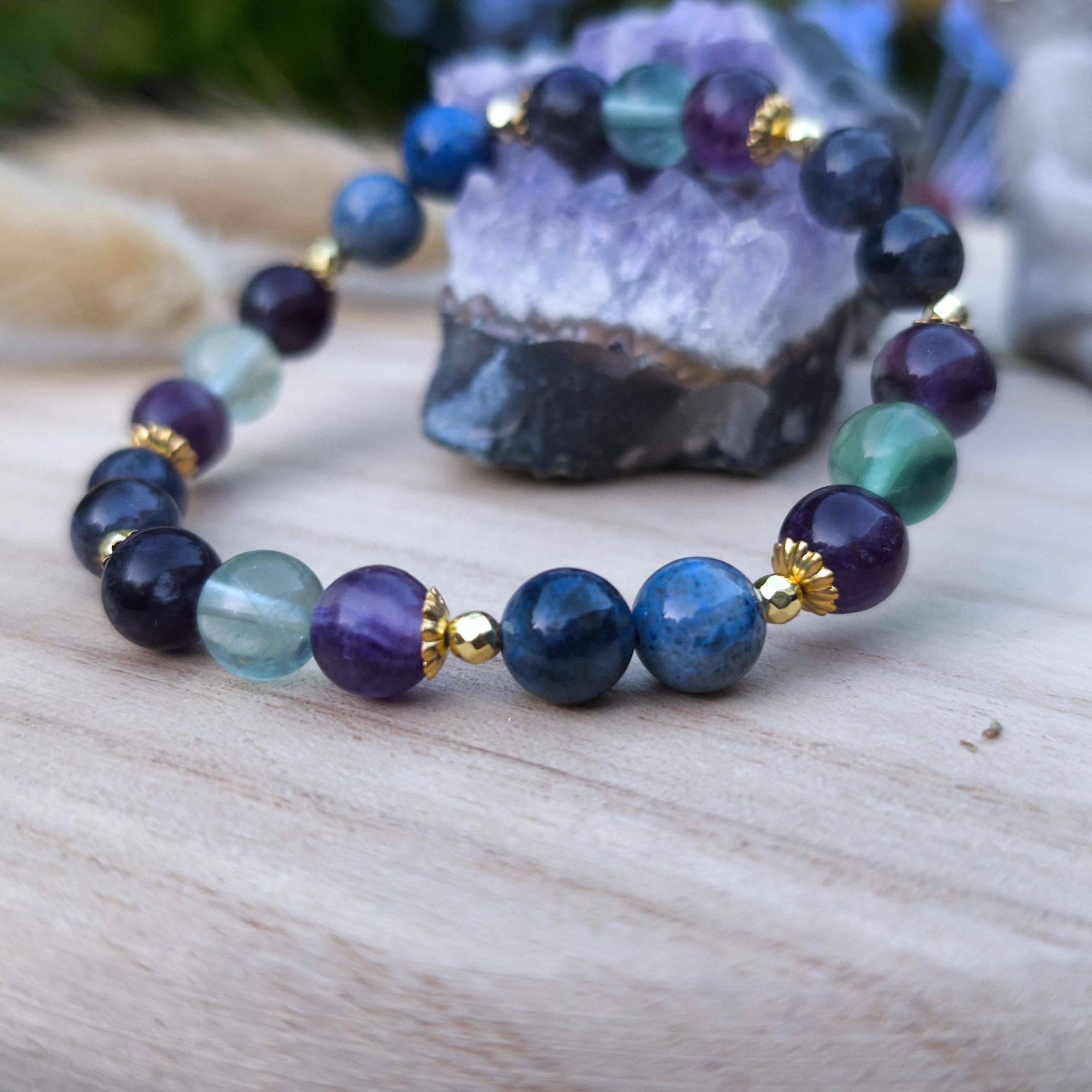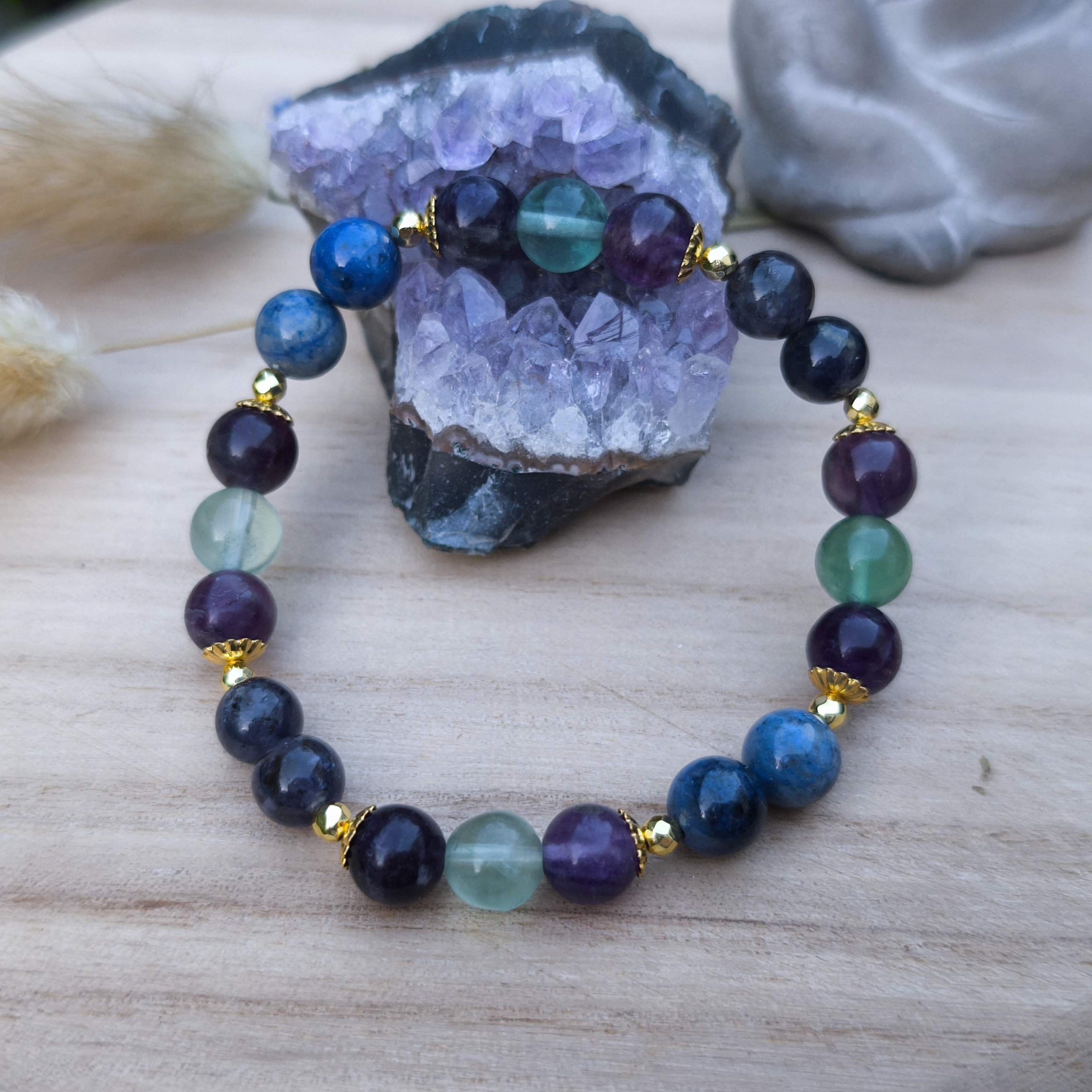 Bracelet artisanal composé de Fluorite multicolore, Iolite et Dumortierite, en perles de 8 mm.