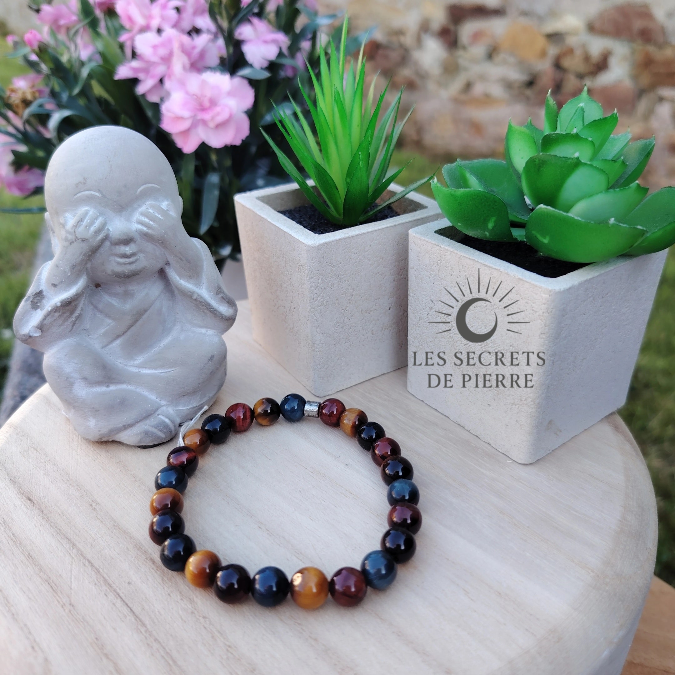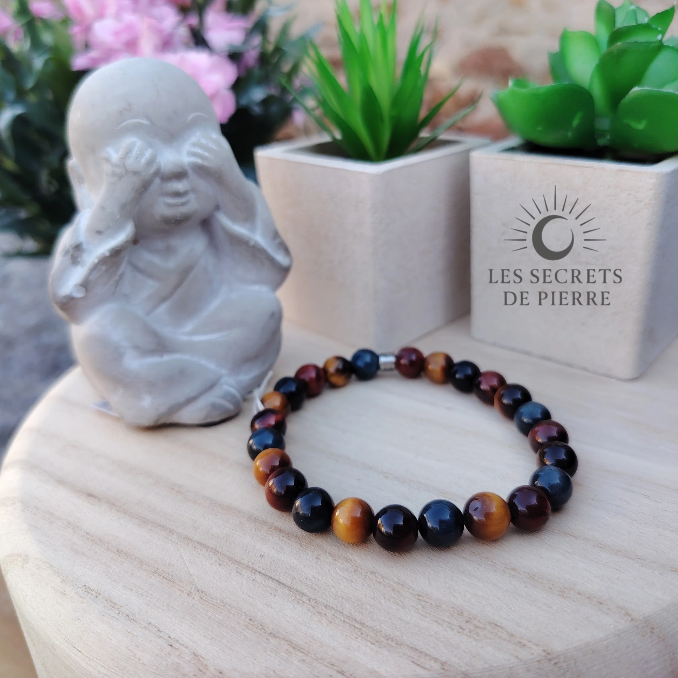 Ce bracelet est une création artisanale composée de perles de 8 mm en œil de tigre, œil de faucon et œil de taureau. Ensemble, elles forment une synergie d’ancrage, de confiance et de protection. Des intercalaires en acier inox apportent solidité et élégance, pour un bijou à la fois esthétique et énergétique.