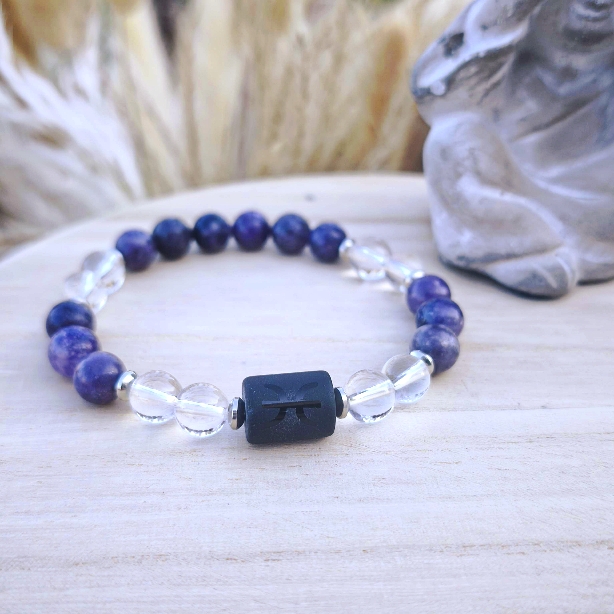 Ce bracelet est composé de cristal de roche (amplificateur universel), de lépidolite (apaisement, anti-stress naturel), et d’une perle cylindrique en onyx mat gravée du signe des Poissons en poli brillant.