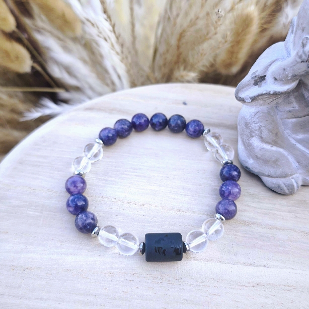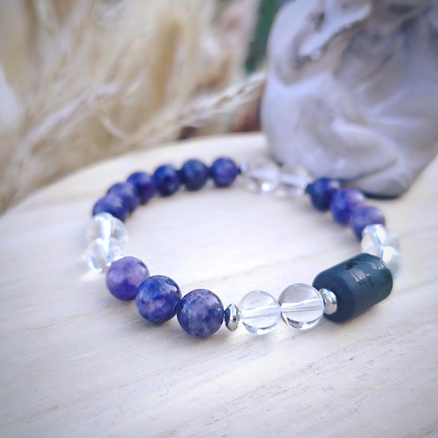 Purifie ton bracelet avec de l’encens de sauge ou du palo santo, une coquille d’ormeaux, un lit de sel ou une géode d’améthyste. Recharge-le à la lumière de la lune  ou sur un amas de cristal de roche.