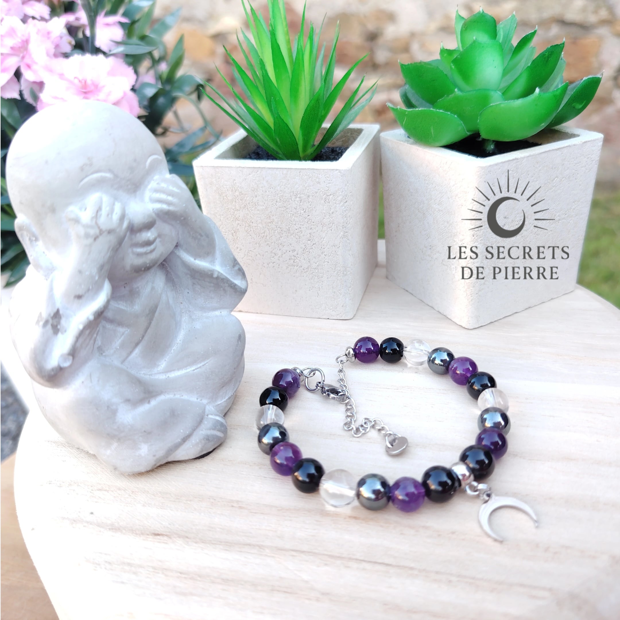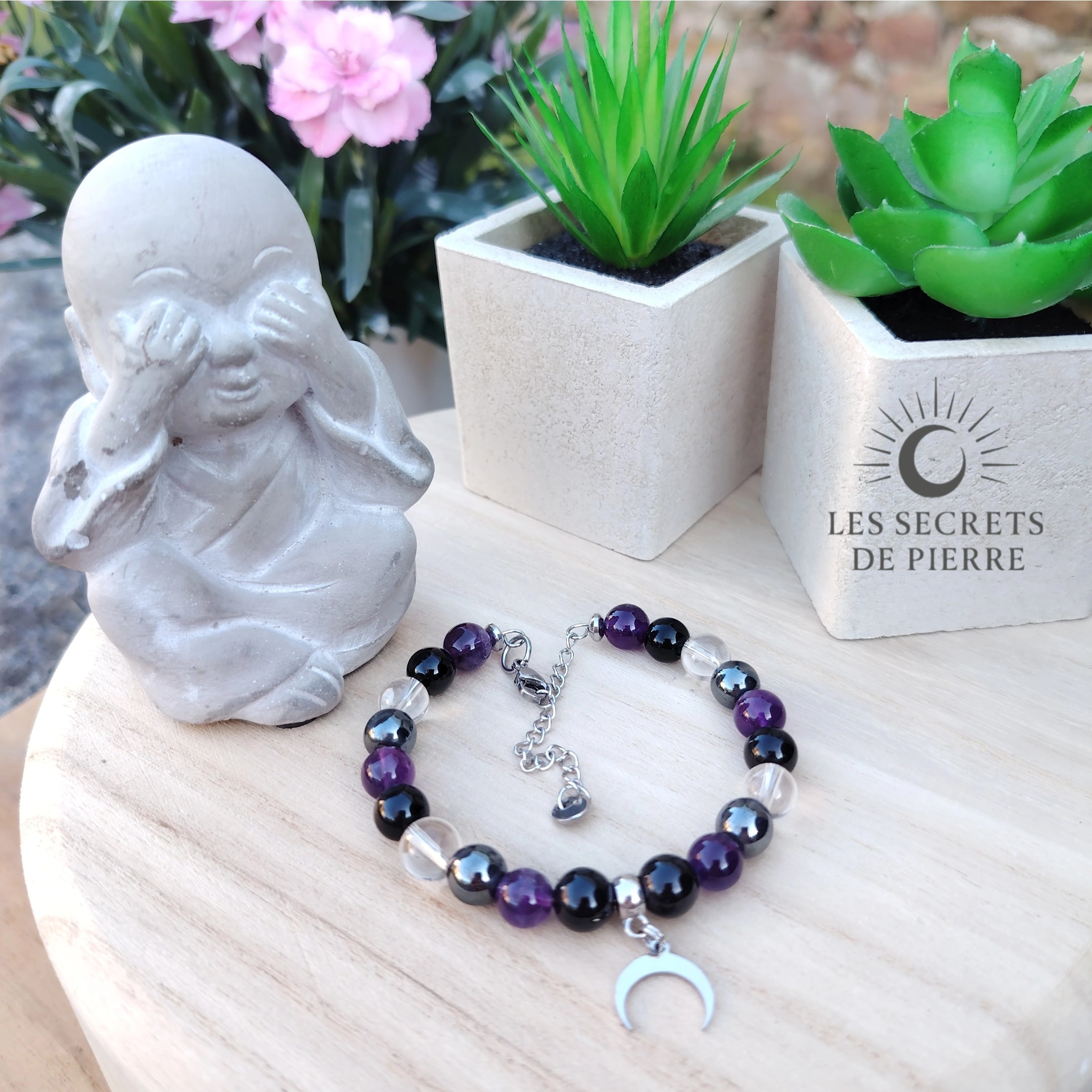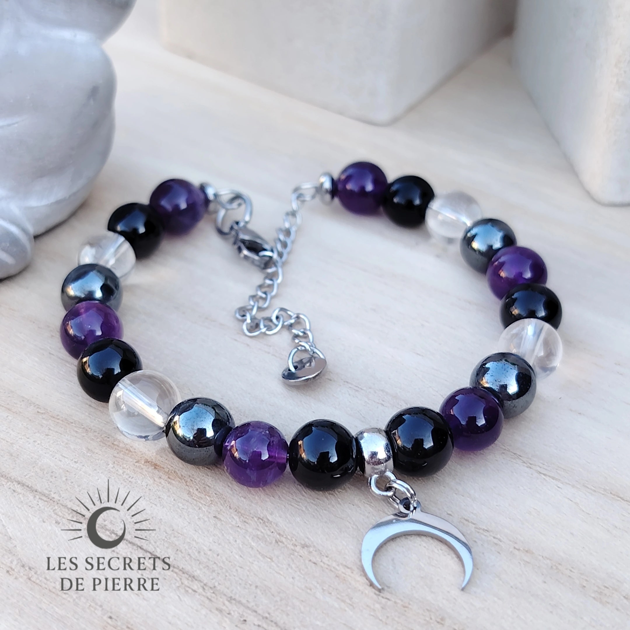 Ce bracelet est composé de tourmaline noire, cristal de roche, hématite et améthyste. Il est monté sur un fil à mémoire de forme en acier inoxydable doré, avec un fermoir en inox et décoré d’une lune en acier inoxydable comme symbole de guidance et de cycles. Un bijou artisanal pensé comme un soutien énergétique puissant et élégant.